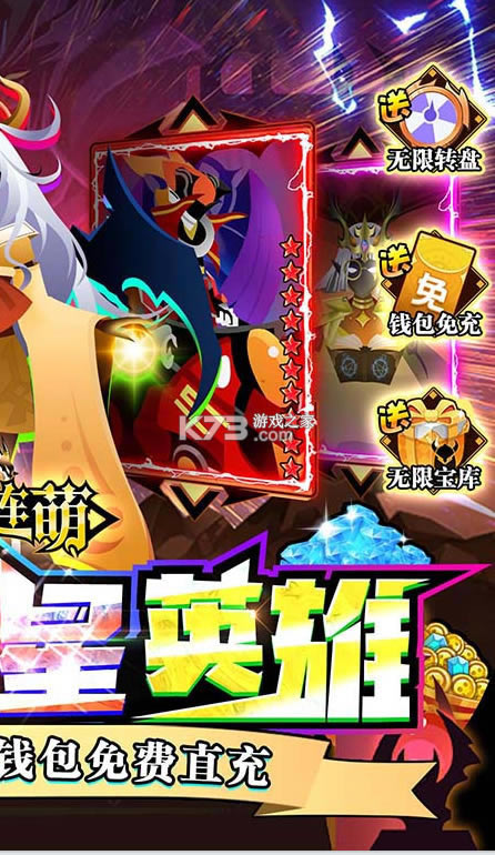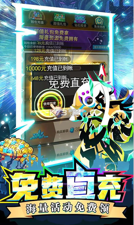 全新暗影风放置手游《神兽连萌(免充任选十星)》重磅来袭,游戏上线就送VIP10、20w钻石、1000w金币、免充特权,免充特权让你0氪也能升满V,海量钻石、投资、礼包免费激活,升级再送万元真充,海量充值活动免费领取!