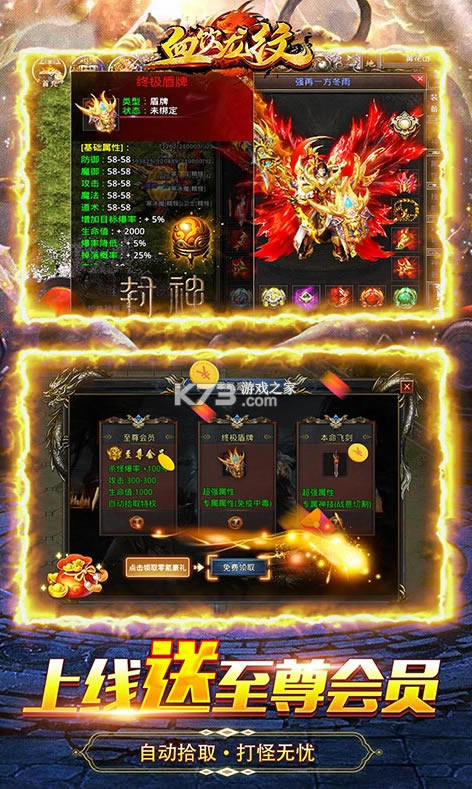 ★上线即送至尊会员:100%爆率+自动一键拾取!终极盾牌:领取即终极,酷爽开局!本命飞剑:超强神器,发展快人一步!上线即可领取!