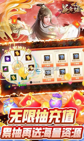 《昆仑墟》不限时间不限次数,升级再领福利超级多,开局就送万充,超值礼包领到手软,无限抽充值黑抽再送海量资源,快速升级全新的体验,热血盟战丰富的玩法,体验极致的游戏快感,成为最强的王者,打造全新的体验感。