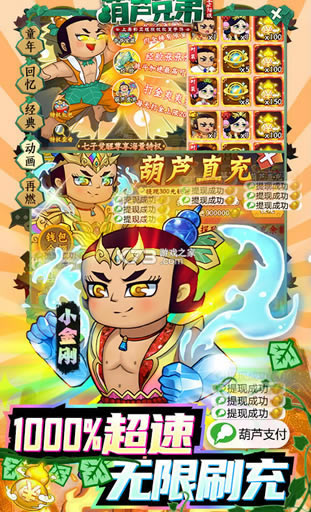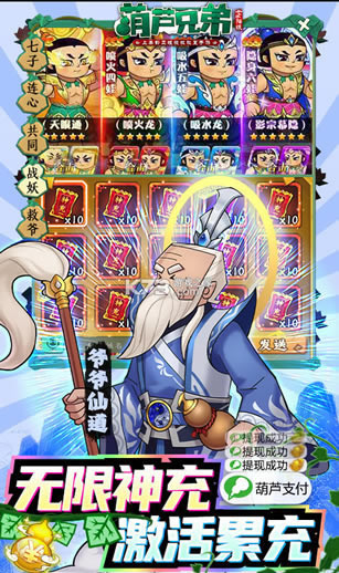 《葫芦兄弟七子降妖》狂送大量的元宝领取超强的高阶券,免费支付快速的提现,获得最高可3w的充值卡,免费支付领取大量的招募券,没有任何限制,挂机扫荡每日领,送橙将葫芦娃,助你快速的降妖伏魔,领取超强的装备。