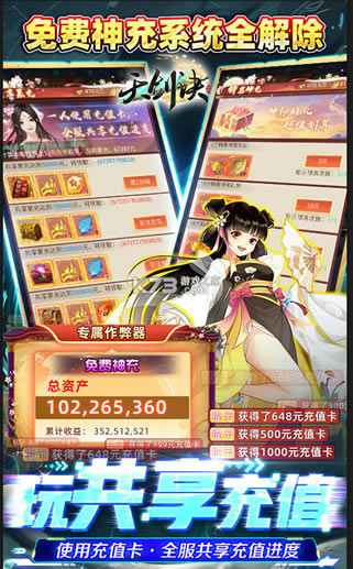 ★【共享充值】:一人得道,鸡犬升天,一人使用充值卡,全服共享充值进度,绝版武器、时装、元神、修仙材料应有尽有