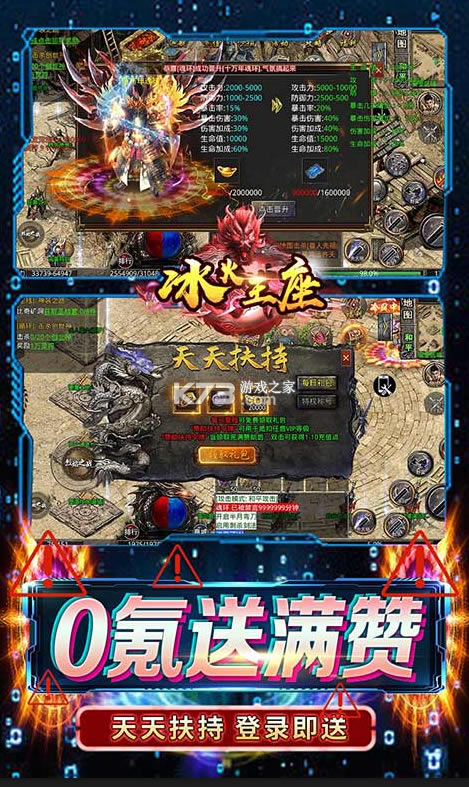 《冰火王座》满赞助不充钱一样爽,领取终极技能创角就起飞,绝对的自由所有的装备均可掉落,绝对的保值,每天嗨翻天,团队pk打造3d的技术引擎,最流畅的光影渲染,自动的战斗打造暗黑魔幻的风格,自动的生成角色创角角色来战斗。