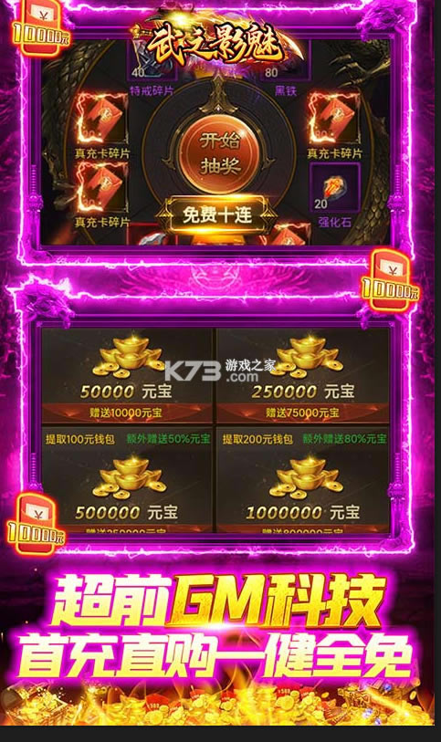 《武之影魅-GM打金直充》携最强GM打金直充版本福利华丽归来!上线送百万元宝、热血神器,无限福利每日壕领不停!上线激活gm特权,快速开启gm商城,绝版时装海量材料无限领取!BOSS爆率全部上调1000%,无限爆真充,福利拉满在线打金!每日领取gm指令,无限领取金币元宝真充卡!快邀请兄弟齐聚沙城,称霸全服!
