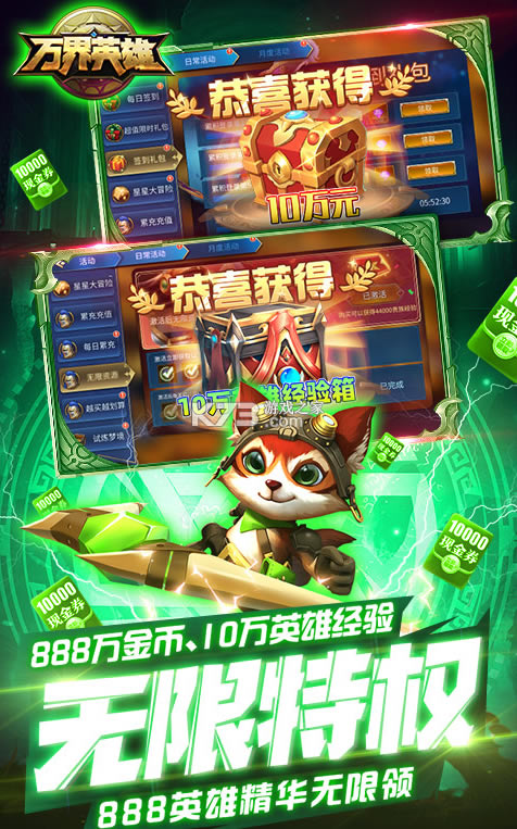 ★【重磅特权】无限资源特权强大,激活后每天可领取888万金币、稀有英雄、10万英雄经验、888英雄精华等大量资源,从此英雄进阶升级不用愁