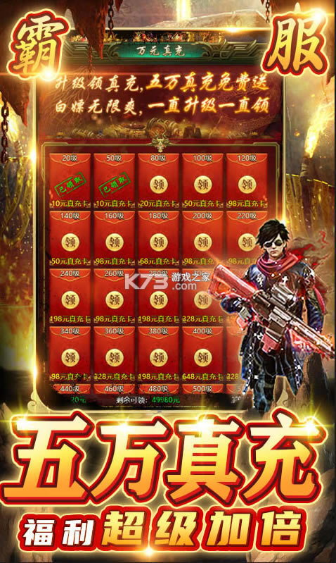 ★升级福利:免费送50000元真充,不仅有海量元宝,还能激活线上和线下累充活动哦!