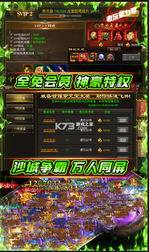 装备全靠打,不氪金也能称霸全服,超高的装备掉落概率,一身神装就是爽