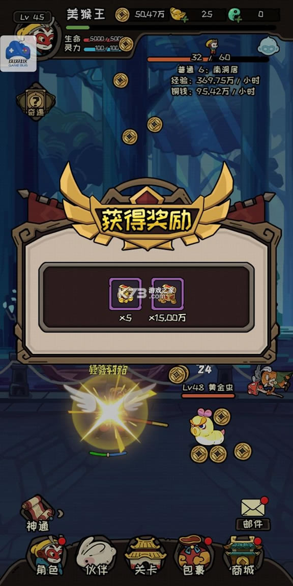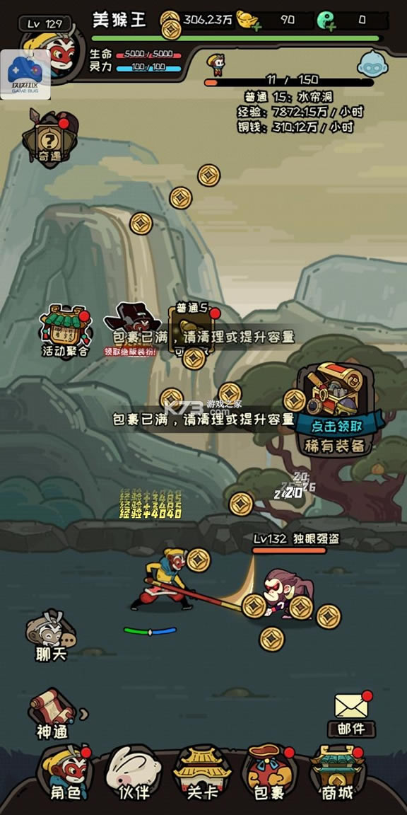 奇遇事件随机出现!只要轻轻一点事件即可提高战力、削弱怪物攻击、掉落大量铜币和元宝!更重要的是,你可以邂逅各路神仙!在这里你不仅可以提升大圣,还可培养灵宠和同道为你出战!打败的怪物,掉落的装备等等都会被手札记录,给你带来小钱钱!