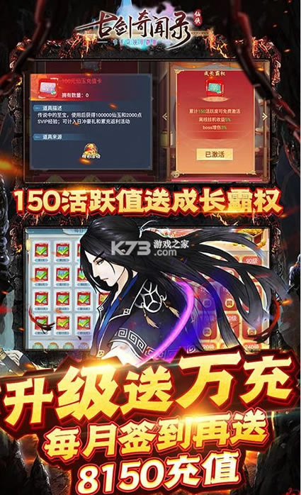 ★签到送充:升级送万元充值卡,签到每月送8150元仙玉充值卡,击杀BOSS也可获得大量的仙玉充值卡