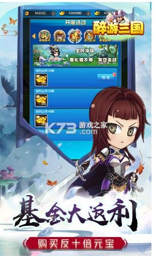《醉游三国》所有的道具都1元宝,福利超多不再为货币而烦恼,元宝随便花,冲击好礼领不停,首充拿好礼共计领大量的元宝,提升超强的战力基金大返利,收服武将攻略城池,三国主题的游戏,福利多多。