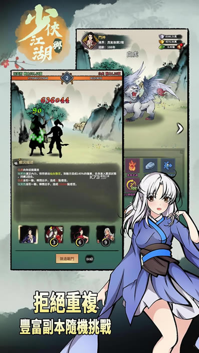 《少侠与江湖》是款修仙武侠题材手游,游戏主打水墨画风的放置玩法,你可以通过挂机提升修为,在江湖中修炼武学,成长为一代江湖大侠。你可以自由搭配各种武功绝学,还可以体验纯正武侠故事剧情。