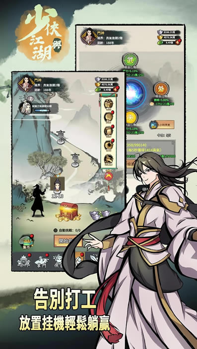 1、放置挂机,轻轻松松,躺成一代宗师;水墨国风,精致的人物原画,细腻的江湖场景