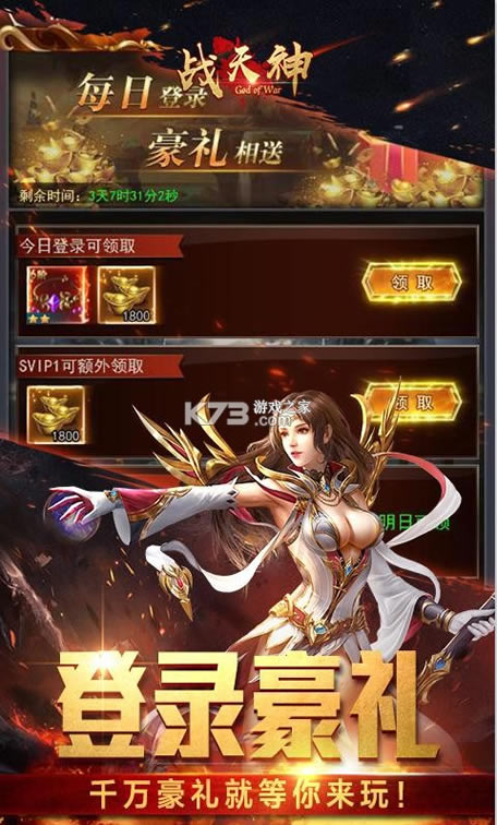 《战天神》登录送vip18,送免费礼包,拥有海量的奖励,线下豪礼送不停,送钻石返利版,宏大的世界观和挑战各种关卡,击杀精英和逼退对手们,丰富多样的游戏装备,带来酣畅淋漓的游戏对决。