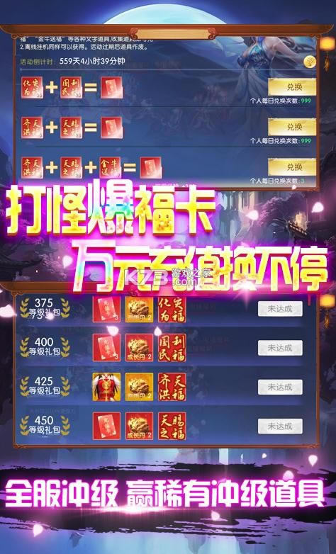 ★后缀说明:玩家通过刷怪,会高概率掉落不同的福卡,当对应福卡集齐,则可兑换不同价值的真充卡,包括6元,12元,50元,100元,500元。其中6元,12元的单日兑换次数为999,通过刷怪,玩家可以轻松在活动期间内得到万充。