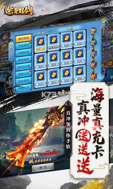 《紫青双剑》上线领礼包和绝世的神兵,将极品装备带回家,体验当神豪的快感,道具买买买,在仙侠的世界上更上一层楼,累积送福利,送首充和GM特权,上线免费领VIP,超值返利多多,签到送对应的充值卡,一键领取吧。