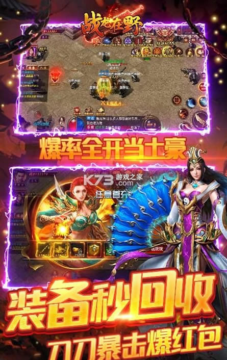 《战龙在野(全民抢红包)》创角即送本职业8阶鬼装随机宝箱,每天签到还送橙色英雄,三职业角色多种经典搭配玩法,基金上调35倍超强福利,游戏内还有交易行等交易玩法,装备分解回收多余装备,强力切割!英雄暴击!所有装备均靠打!稀有极品装备狂爆!散人天堂!只要努力所有极品都尽收眼底!