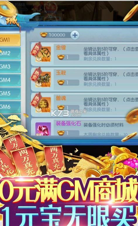 3、满级GM免费赠送,GM商城道具通通1元宝!