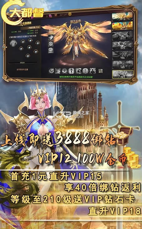 ★上线即获得VIP12,3888绑元,100W金币,加快升级速度和运营福利。