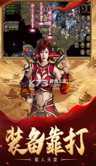 自由PK,体验杀戮快感,练级、打宝只为站在沙巴克的城墙!新增多种玩法:夺宝奇兵、盘古之地、皇族秘宝,增加不一样的感受九种职业组合、六大合击技能,首领刷不停,装备全靠打,散人打金,土豪激情