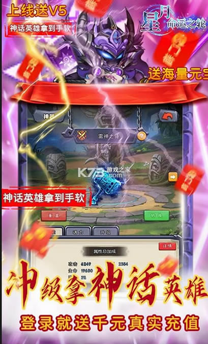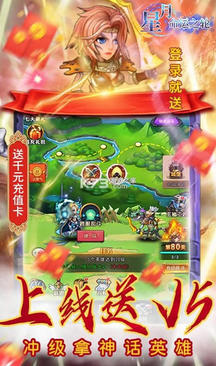 《星月命运之轮》天天登录完成7日任务即可拥有丰富的福利,送千元充值快速来行走江湖,在前期特别能抗打,具有超高的效率,仙玉灵石随意赠送,上线满V,带你进入超萌的世界中,开启战斗之旅。