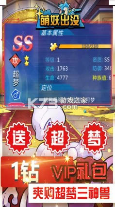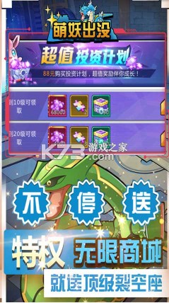 创角即赠满级VIP18,48888钻石;65级使用SVIP4激活卡,可以直升SVIP4等级;闯关副本无限爆萌妖券,可无限兑换充值卡,500元充值卡、1000元充值无压力兑换;无限商场来袭,无限资源,即刻爽爆;VIP礼包,免费1钻石购买,三神兽、顶级超梦等壕宠立即到账!