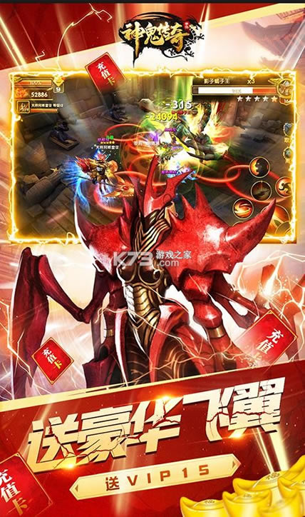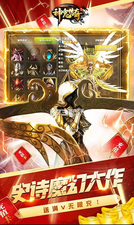 《神鬼传奇-满V无限充》是一款大型3D仙魔风格MMO手游。10级开狂欢礼包有机会得到极品星座宠物☆处女波瑟芬☆!开局即送尊享贵族15,100元充值卡*1,绑定元宝*28888,紫水晶*100,金币*400万,贵族礼包、每日签到领取海量充值卡碎片大礼包送给你!使用礼包码领取总计1000元充值卡,更送你超酷炫翅膀,天天还送充值卡!!!精致的美术画面通过炫酷3D效果为玩家呈现了一个人魔大战的历史战场。绚丽坐骑、特色宠物、逆天神器、极品装备、超级BOSS、征途历练等玩法供玩家探索,踏上君王之路。全自由化的PK对抗,极致激爽的战斗对决,将最大限度满足你对仙魔手游的所有幻想!