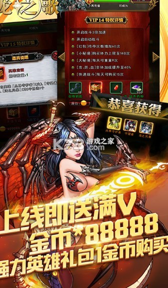 1、上线即满V,金币*8万、银币*500万,强力VIP礼包1金币购买。