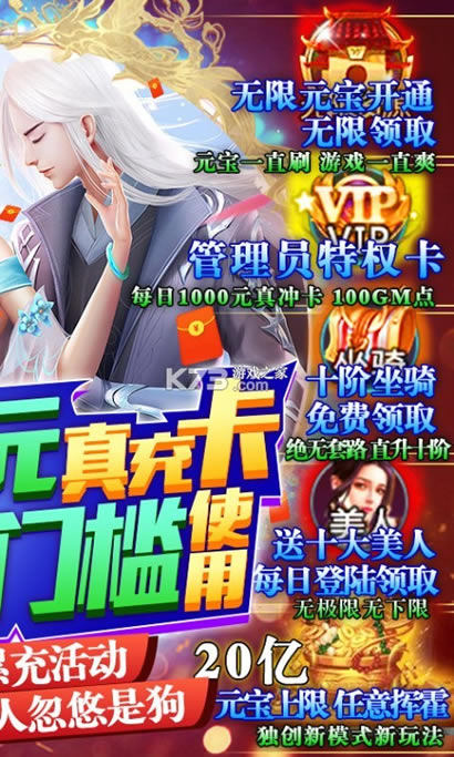 ★上线即送满VIP、绑定元宝300W、铜币500W,元宝200W,在线送万元真充卡、上线就神权GM、极品坐骑、登录送10位美人、小怪满地爆真充卡、升级送神装,海量福利领到手抽筋!