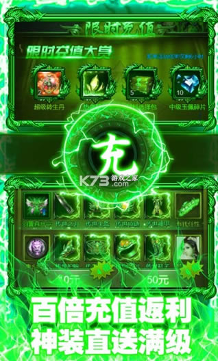 ★上线送vip15,元宝88888、金币*10000万、热血神剑(1阶)*1、雪国精灵(角色时装)*1、500元真充卡
