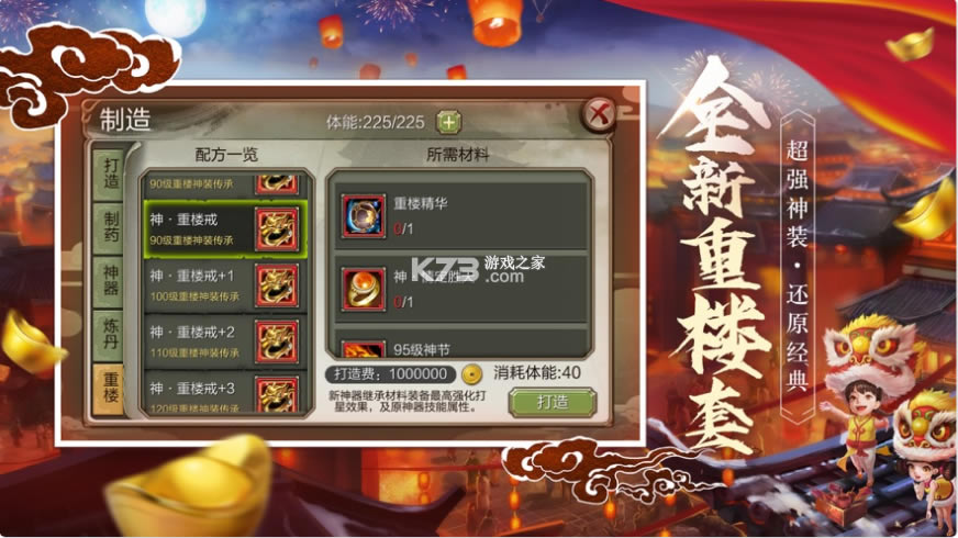 新增多个级别神装重楼套,肩、手、戒指、护符应有尽有,原神装无损转重楼,无须爆肝!高级重楼可再提升神装养成上限,加量不加价!