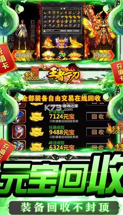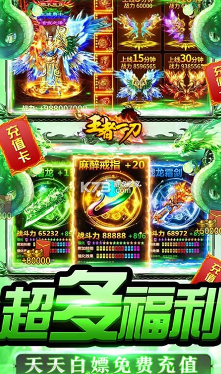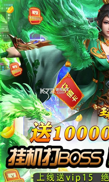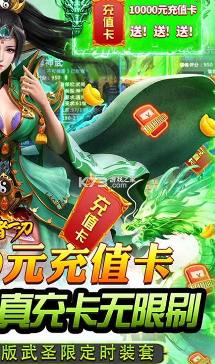 经典传奇,回味无穷!上线送vip15、金币1亿,再送绝版武圣关羽时装套。创角即领取万元充值卡,每日登录领取真充卡!简直好玩到爆!