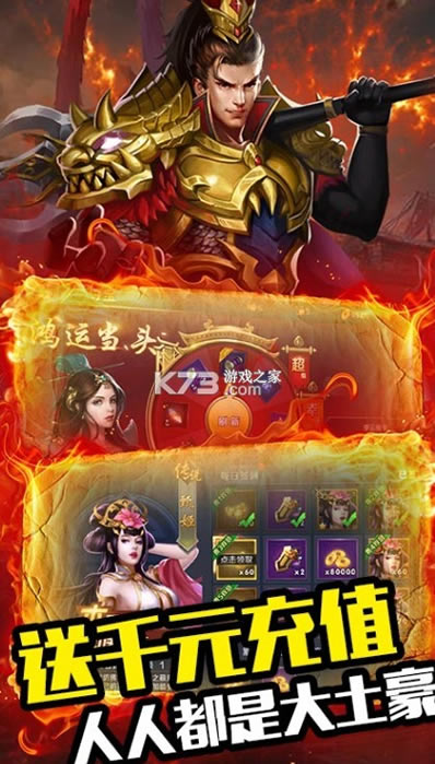 玩家登陆更能领取到满级vip,海量元宝还有千元充值礼包,额外还有每天无限抽,让你玩得更爽!在这里你将感受到一个历史纵横交错的世界,关羽VS斯巴达谁才是最强的传奇人物!快来加入战斗吧!