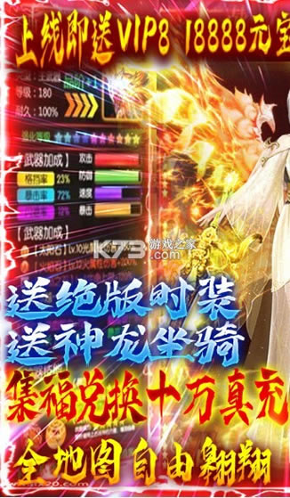 ★上线就送VIP8!领取免费首充可到VIP12!立刻领取18888元宝!188W金币!超多奖励领不完!