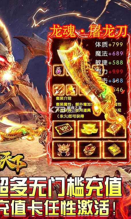 升级节奏超快,打怪掉经验丹,使用后可直升一级,打得越多升的越快!VIP等级不用花钱,完成指定条件即可轻松提升。