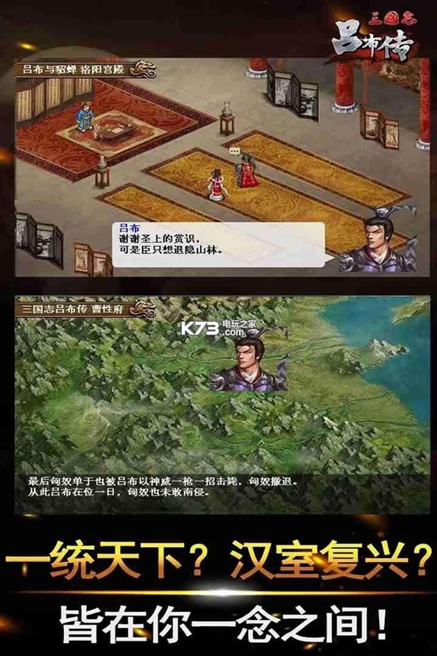 《三国志吕布传》是一款以三国历史人物吕布为主角而展开的角色扮演战棋游戏,游戏虚构了吕布在三国乱世中挣扎的故事!让玩家通过战斗自行选择吕布不同的结局,复兴汉室。