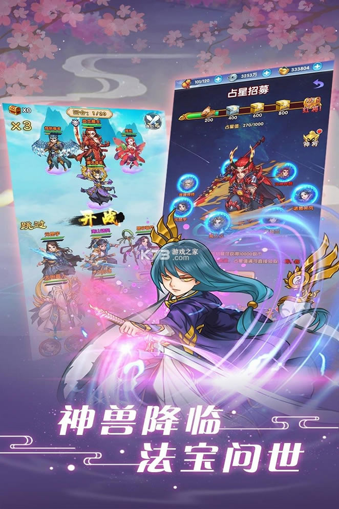 升级:与主角升级不同的是,主角只能通过战斗获得经验升级,神将升级需要消耗卡牌和蟠桃,且主角等级达到8级开启。