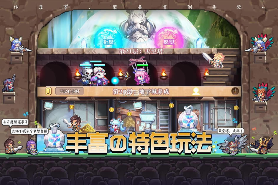 《异次元大作战》是一款日式轻策略的放置类手游。复古精致的像素画风,每位异次元勇士均有精美立绘和复古像素萌萌哒小人,满满的怀旧情怀让玩家欲罢不能。多样的冒险玩法,闯地下城、激斗天空塔、探索无尽秘境、挑战世界BOSS,更有知名声优助阵,与您一冒险前行!