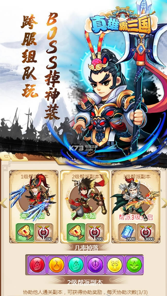 《真雄霸三国》是一款以三国时期为背景的Q版卡牌新作,24小时轻松离线挂机,运筹帷幄之中,决胜千里之外!。 游戏还原三国历史画卷,拥有独树一帜的“冲锋式”战斗模式, 告别传统策略类回合制出手的战斗套路,让战场更加真实!上百种武将各具特点,激萌个性,炫丽技能,让战场更加多变! 游戏更加入了强大的灵宠,为主公守护,全新的挂机玩法,还有更多轻松、有趣、比拼RP的玩法等着你来探索~ 游戏特色: *内置辅助,挑战BOSS无CD *懒人模式,轻松挂机躺着赢 *激萌神将,卖萌打架两不误 *福利多多,每日奖励拿不停