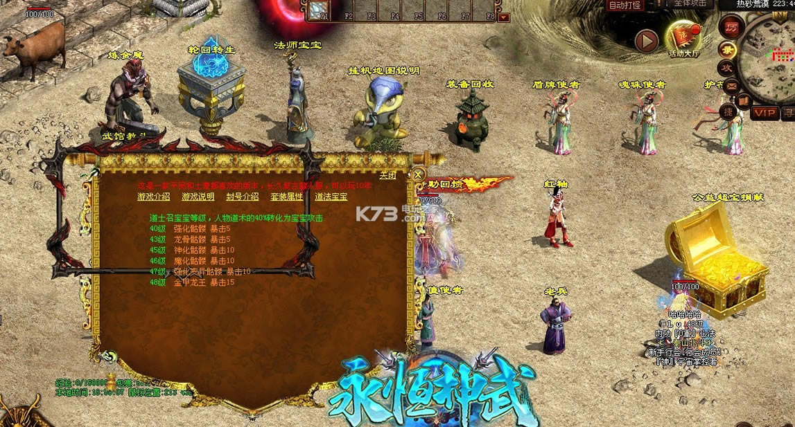 永恒神武是一款拥有诸多传奇经典玩法的传奇手游,热血激情的在线PK对战,丰富的玩法想怎么玩都是可以的,无论是元宝还是经验都是相当的丰富,超值大奖等待着每一位热爱攻沙大战的玩家,喜欢永恒神武的朋友快来下载吧!