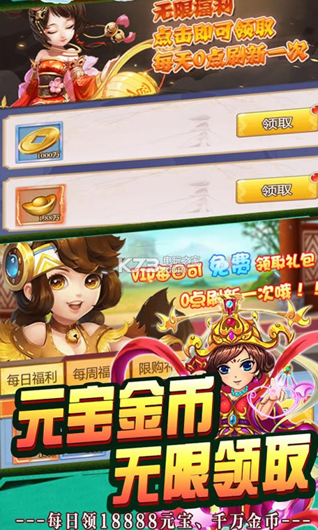 ★元宝、金币无限送:永久每日签到即送18888元宝、1000万金币