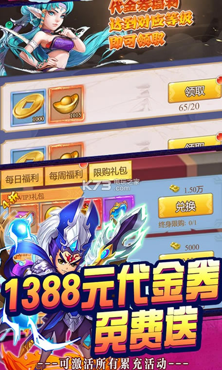 更有群仙比武,封神榜,大闹天宫,三界战场,海量仙盟玩法等你来战!全新无限福利,真实充值券、元宝、金币、十连抽券、万能碎片每日无限免费赠送!