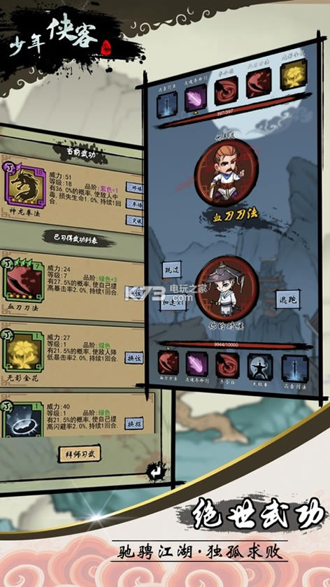 2.武功套路是游戏最内核的玩法;游戏设置108门武功,可以拜师学习。每个玩家都可以