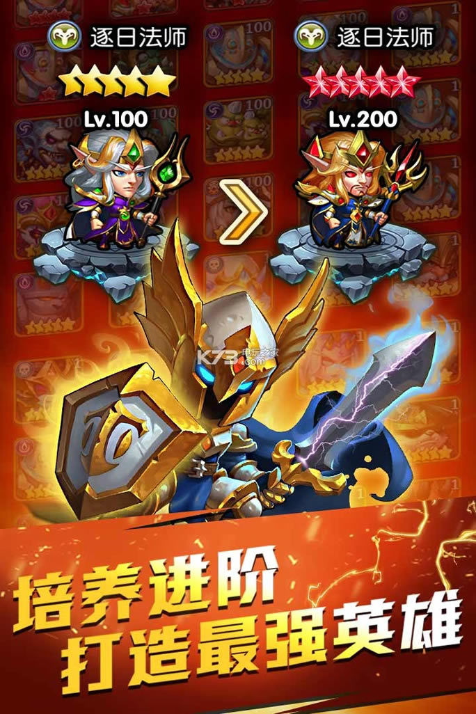 3、竞技场pk,副本剧情挑战,随心搭配英雄阵容挑战,招募培养英雄,让他们自动征服战斗