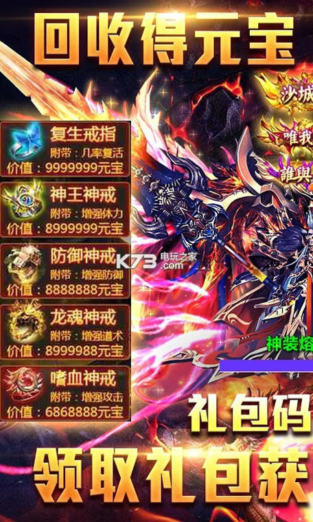 1、充值100RMB礼包:永恒神戒(2阶)*1、兽灵玄晶*10、圣兽精石*10、圣兽碎片*10、神装碎片*300