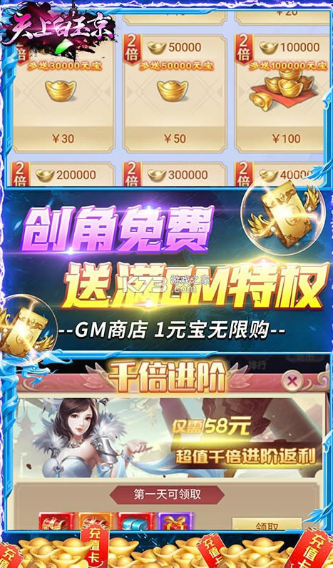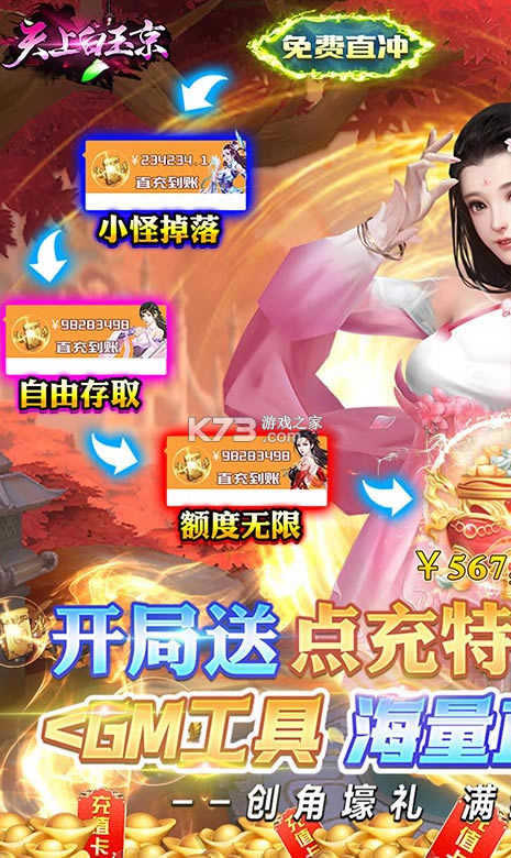 《天上白玉京(GM工具点充)》开局送点充特权,手速越快,金额越高,无限648元点到手软!开局送直购币*8888,至尊称号,超值礼包,GM装备全部免费破解,钱包余额可直接兑换直购币!“直升260”58元送直升260级经验丹,送100倍真充,直购币*5000,传奇属性丹·三阶*15000!