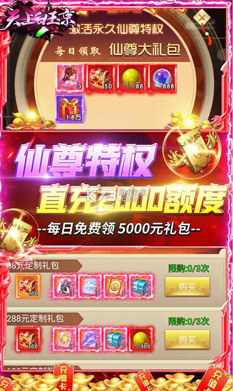 ★全新特权:仙尊专属特效称号,提升2000元直充额度,每日免费领取5000元特权专属礼包!