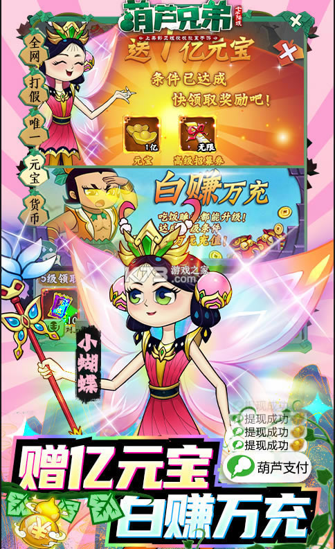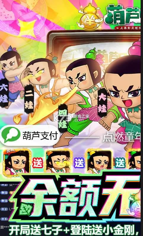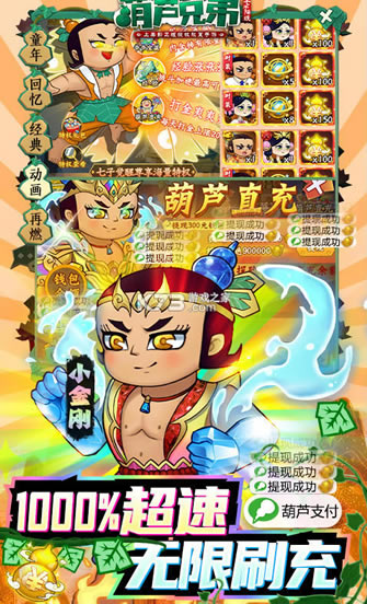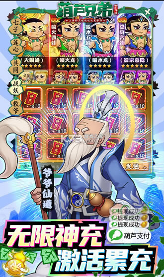 《葫芦兄弟七子降妖》狂送大量的元宝,白送万元真充,领招募券和神充卡和橙将葫芦娃,还原动漫的情节轻松练级休闲挂机,实现免费提现,完成一系列的冒险和挑战,在这里救出爷爷,创新式的玩法,开启去战斗。