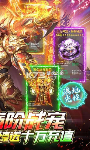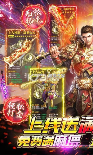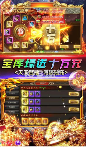 每日在线、参与玩法可获得欧皇抽奖券及充值卡福利,万充宝库无限抽充值,累抽送十万元充值!超高爆率刀刀光柱,装备钻石回收,首爆送海量钻石奖励!这里就是真正的散人天堂!