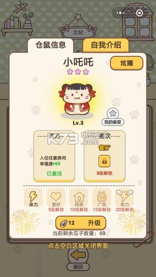3、不断的去通过喂养瓜子来提升仓鼠等级,当达到一定等级还能解锁同居功能。