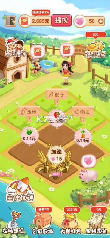 青青草原红包版游戏是一款休闲经营赚红包类游戏,游戏以卡通Q版的画风模式为主,玩家可以自由经营你的农场,解锁更多土地,收集种子进行种植操作,完成游戏任务即可领取红包奖励,最低0.3元起提现,对游戏感兴趣的话不妨点击下载试试!模拟种菜类红包游戏,游戏中的各种土地需要你去扩大,还有趣味精彩的经营玩法等你去体验,每一场农作物收获都会为玩家带来不少的奖励,而且玩家还可以将收获的农作物出手变卖,让你的农场可以在这快速发展。
