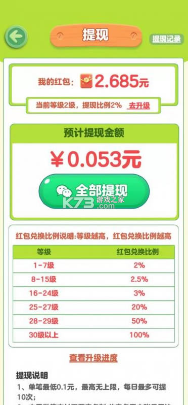 经过测试,新玩家不到一分钟按照提示完成新人教程,就能马上提现0.3元一分钟内就到账了,可以说是非常给力的一个红包游戏。